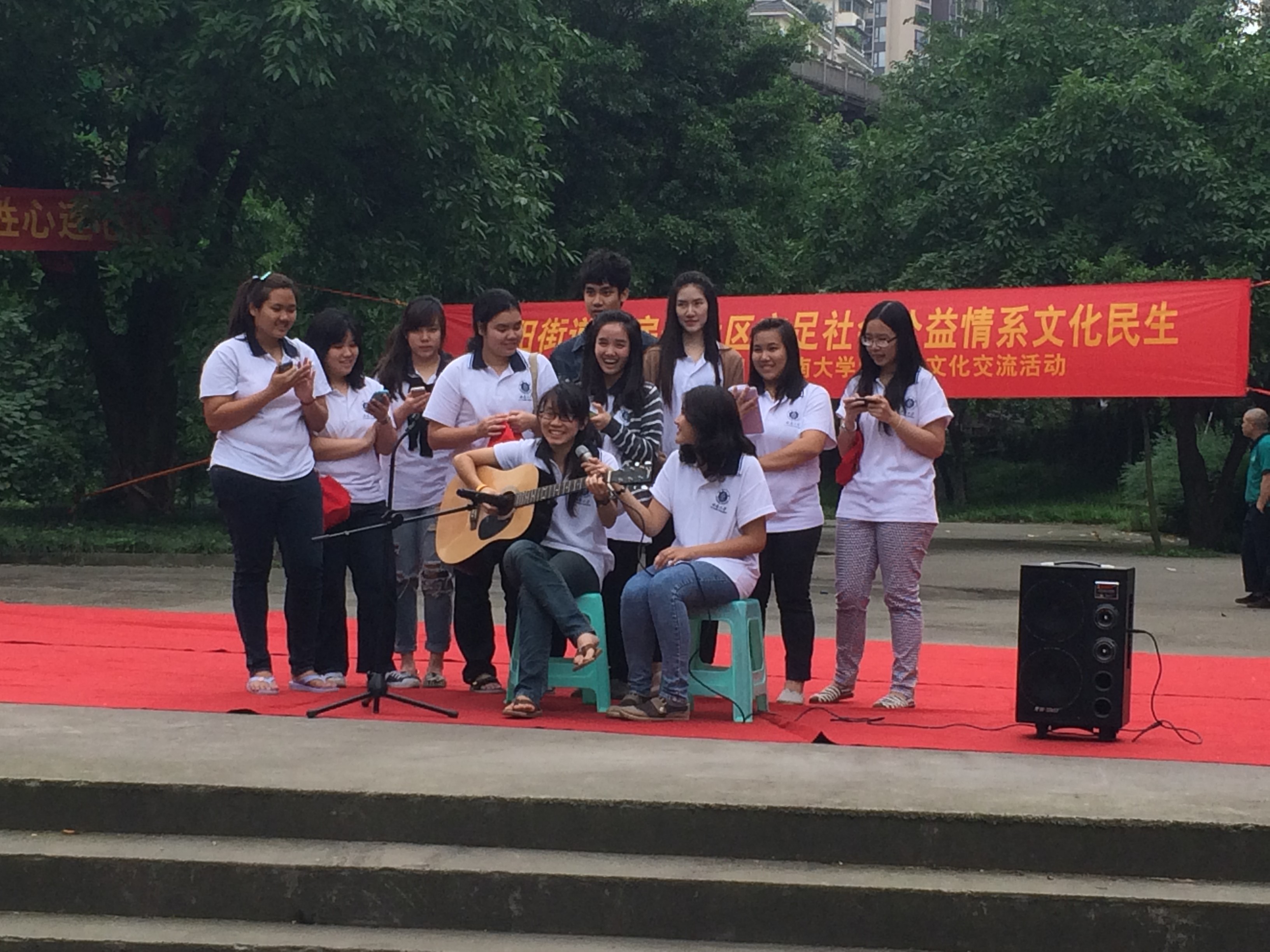 留学生们首先在社区工作人员的带领下参观了社区文化服务中心的工艺美术室、心理咨询室、老年活动室等,并亲身体验,对各项健身及益智设施充满了浓厚的兴趣。随后,留学生们和社区的民众们齐聚于广场,进行文艺表演和文化交流。朝阳街道文化服务中心主任何羲薇出席了本次活动。伟的国际1946bv学工办主任陈雨曦发表了讲话,介绍了伟的国际1946bv及“洋雷锋”小红帽服务队的情况,并预祝此次 “洋雷锋”小红帽服务队社区行活动取得圆满成功。社区民众和留学生们精心准备的节目精彩纷呈,高潮迭起。社区民众表演的舞蹈《爱我中华》展示了中国人的蓬勃朝气,多国留学生联合表演的吉他弹唱《情非得已》充满了青春活力,社区老人表演的太极拳、太极剑、功夫扇等尽显了老年人的老当益壮,泰国留学生罗俊勇表演的京剧《定军山》压轴登场,华丽的戏服、字正腔圆的演唱、神采飞扬的表演更是赢得大家的阵阵掌声。