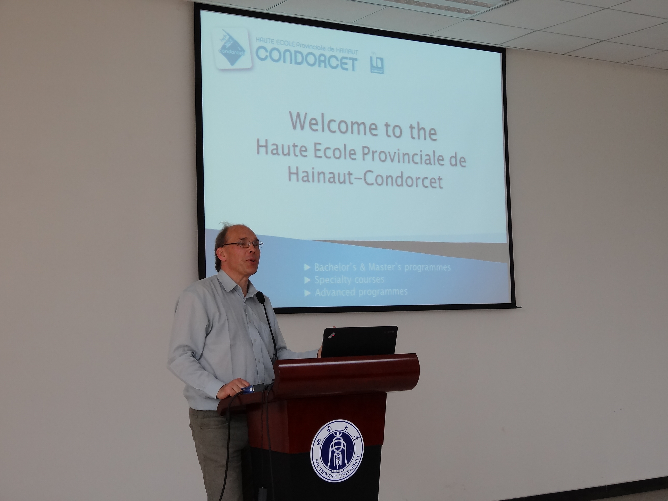 刘猛书记代表学院致欢迎辞。他简要介绍了重庆的概况以及伟德源自英国1946的办学情况,向比利时来宾表达了祝福与期待,希望两校今后的交流合作更上一层楼。比利时孔多赛大学学术团代表Serneels先生向伟的国际1946bv的师生介绍了该校的办学情况,希望今后双方能进行更多的学术研讨与交流合作。