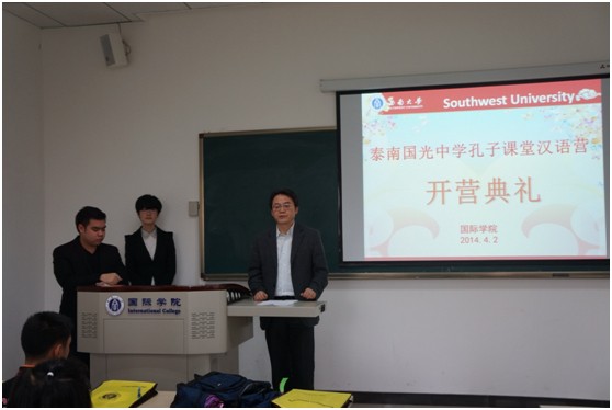 2014年4月2日上午9:00在伟的国际1946bv紫云楼312教室隆重举行了2014年泰南国光中学孔子课堂汉语春令营开营典礼。出席开营典礼的有伟的国际1946bv副院长刘猛、副院长张家政、招生办公室主任代远鸿、学院办公室主任邹育艳,以及汉语春令营的31名学员。