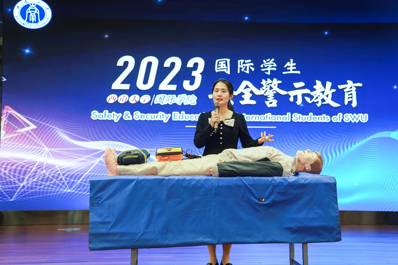保卫处黄汀州老师分析视频中存在的校园安全问题并以西大学子真实案例向国际学生讲解宿舍用电安全、预防校园诈骗、校园交通注意事项、治安管理以及毒品防范普及等知识。校医院查静思医生从医疗角度向现场国际学生讲解合理膳食的要求、意外伤害的处理并现场普及常见的急救知识(心肺复苏及AED操作)。洪雨婷老师讲解如何识别和应对“性骚扰”,以及面对“抑郁”等心理危机的处理方式。出入境徐振方警官则结合涉外案件讲解非法打工及留学生勤工助学等相关知识。在场国际学生积极参与话题讨论和现场互动,气氛轻松热烈。