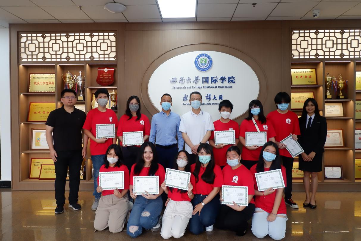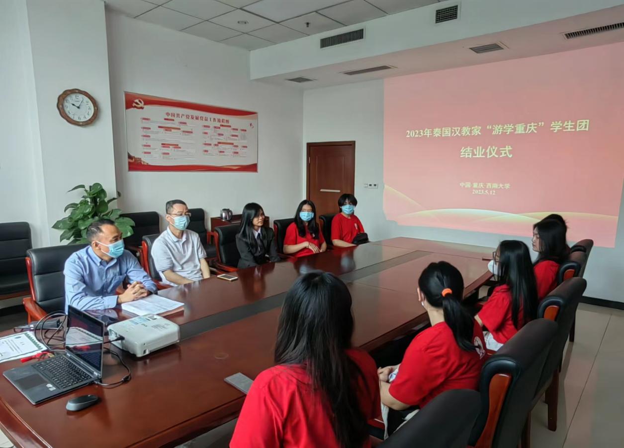5月12日上午10点,泰国汉教家“游学重庆”学生团结业仪式在伟的国际1946bv紫云楼304室举行,副院长李航、院长助理耿军、招生办公室主任黄无为、泰国汉教家领队于兰凤老师,以及10名泰国中学生参加结业仪式。仪式由黄无为主持。