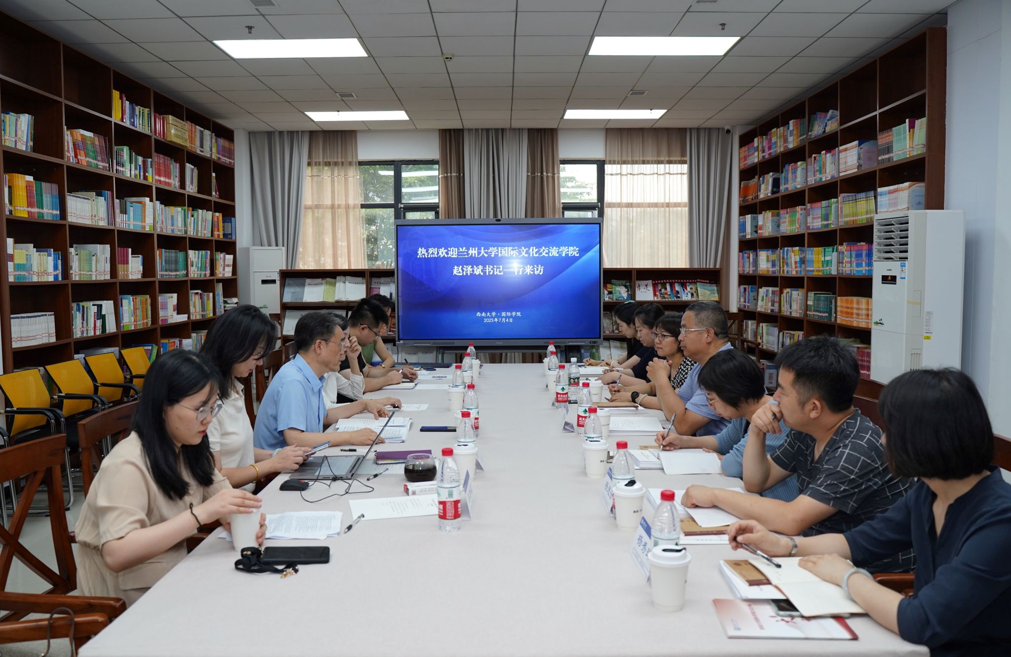 7月4日下午,兰州大学国际文化交流学院直属党支部书记赵泽斌一行7人来学院交流,调研来华留学质量认证工作开展情况、国际学生培养先进经验和做法、国际学生日常管理和服务工作、国际教育提质增效典型举措等工作。学院党委书记刘猛,汉教系、教学办、综合办、招生办及学工办负责人参加座谈交流,会议由刘猛书记主持。