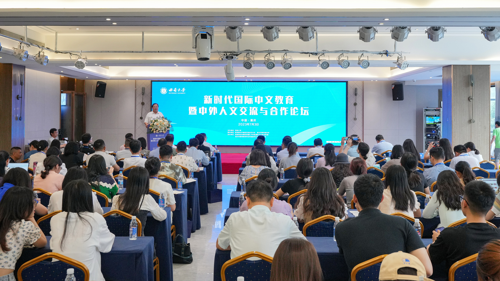 7月3日,新时代国际中文教育暨中外人文交流与合作论坛在学校举办。本次论坛由学校主办,教育部中外语言交流合作中心和重庆市教育委员会指导支持,成渝地区双城经济圈孔子学院(国际中文教育)联盟和重庆市高等教育学会外国留学生教育管理分会协办。海内外160余名专家学者和高等院校相关管理工作者线上线下参加论坛,从事国际中文教育的2000余人观看线上直播。主题发言及专题讨论等采用线下会议形式进行。