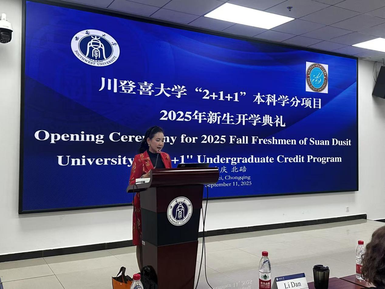 随手,泰国川登喜大学副校长蓬差尼・盖奈女士致辞。她表达了对新生们在跨文化学习中突破自我、收获成长的殷切期待,并展现了对两校合作项目的坚定信心。