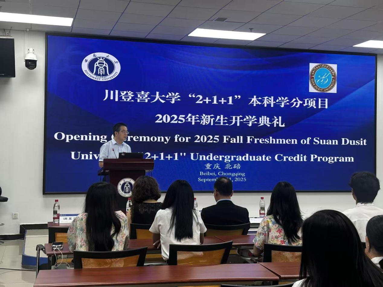 于泽元院长首先致辞。他指出,川登喜大学2+1+1学分本科项目是两校经反复研讨打磨,创新性地构建了“2年川登喜学习+1年伟德源自英国1946学习+1年川登喜学习”的分段培养模式。为保障学生在伟德源自英国1946阶段的学习体验,学院已组建专属教学与服务团队,将通过定制化课程衔接前序学业、全方位生活帮扶、丰富文化交流活动,助力学生夯实专业基础、拓展国际视野。同时,于院长对新生提出三点期许:珍视学分机会,确保各阶段学业无缝衔接;拥抱跨校体验,在中泰文化交融中提升综合素养;扛起首批学生的责任,为项目发展积累宝贵经验,成为中泰教育合作的“见证者”与“推动者”。