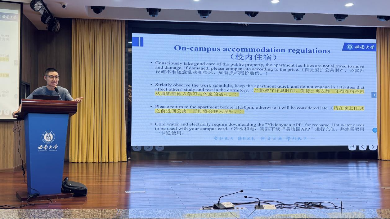 辅导员王湛明老师就留学生校内外住宿、消防安全、预防诈骗、宗教活动管理等事项进行说明,提醒新生提高警惕,严格遵守中国法律法规和宗教政策。