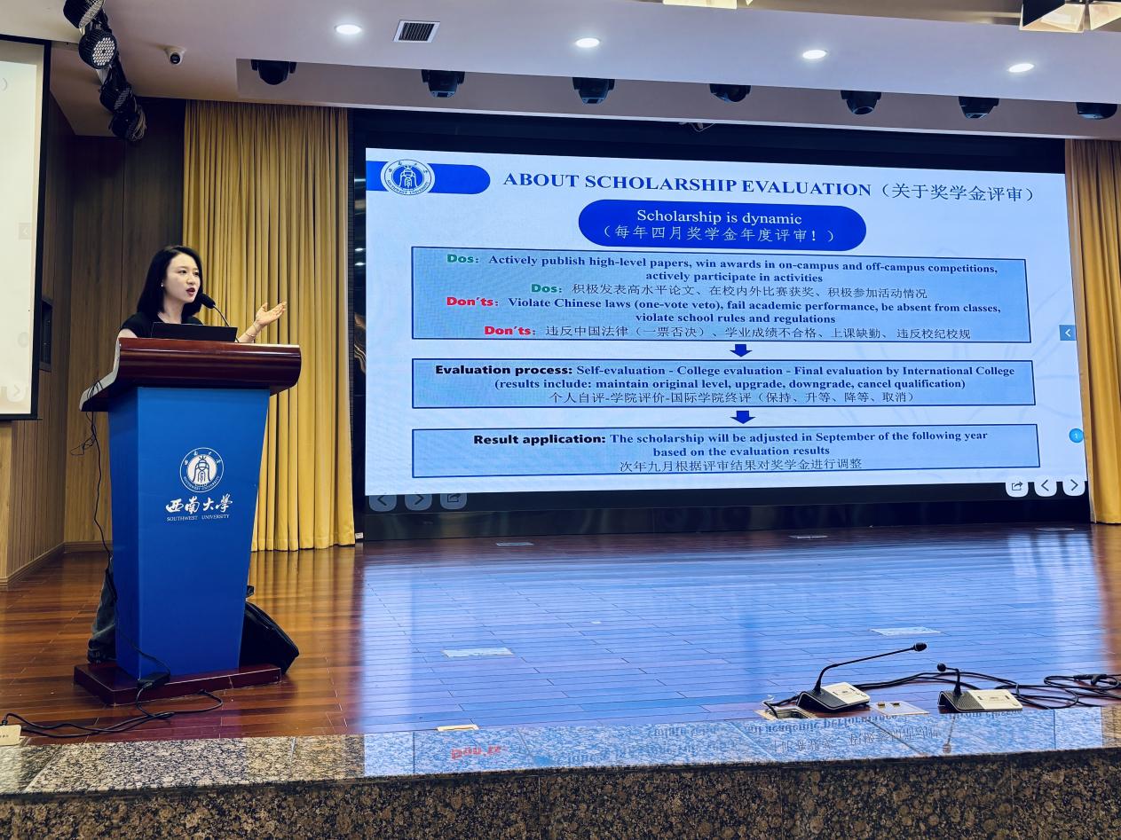 辅导员仇淼老师聚焦奖学金动态管理制度,对奖学金年度评审要求展开说明。她还介绍了来华留学生保险制度,详细说明保险适用情形与不适用情形,讲解理赔标准及报销流程,帮助新生掌握保险相关操作要点。