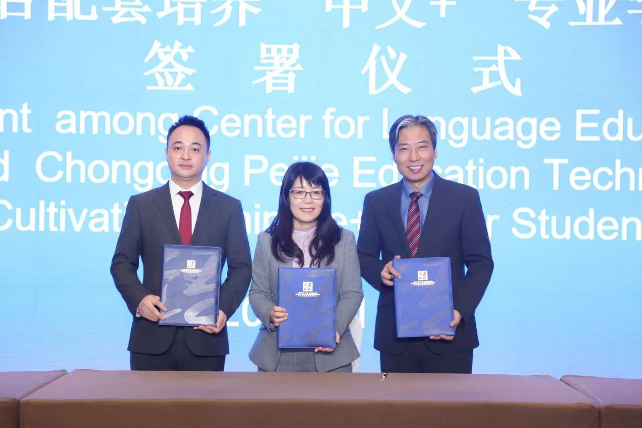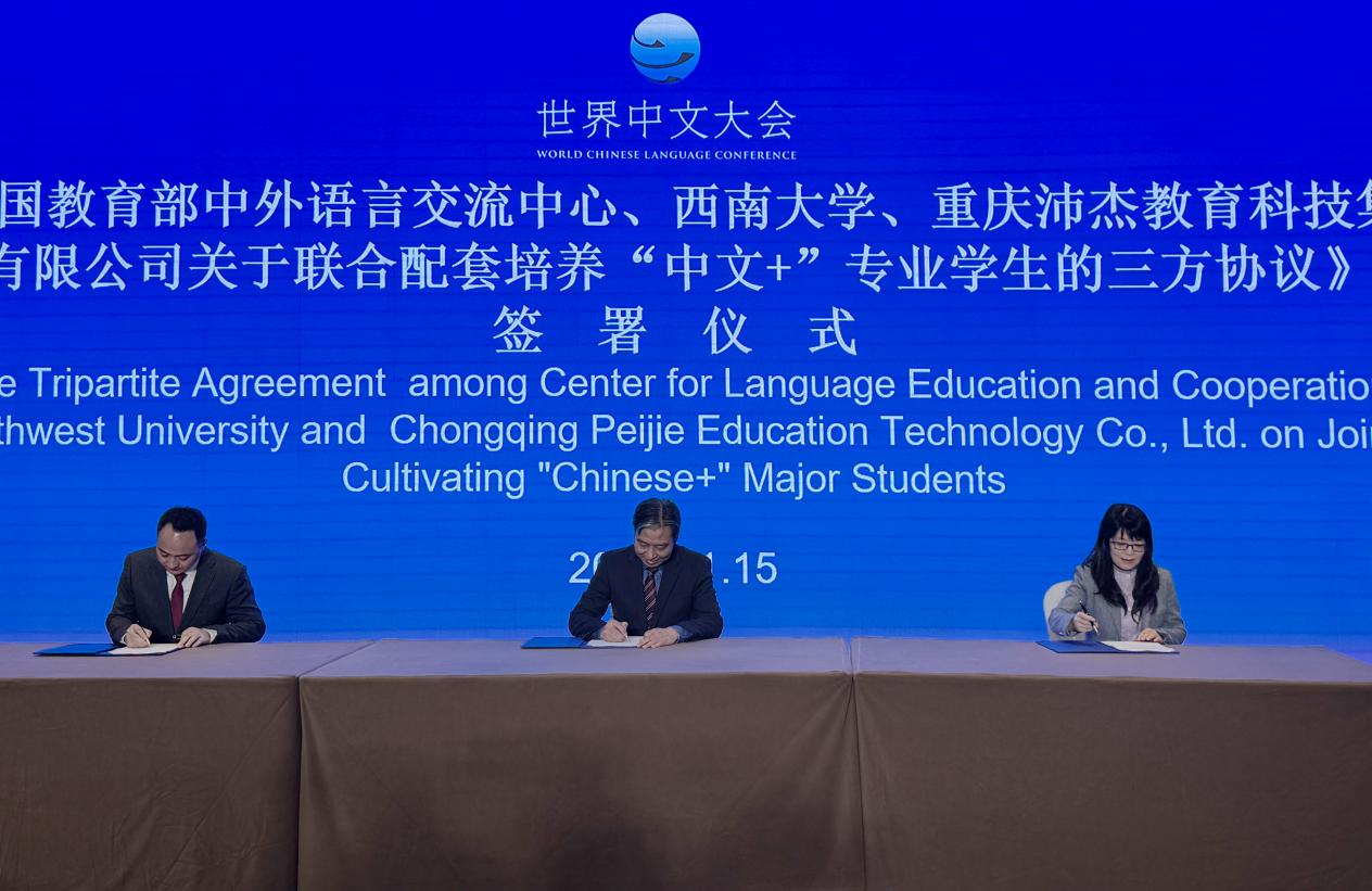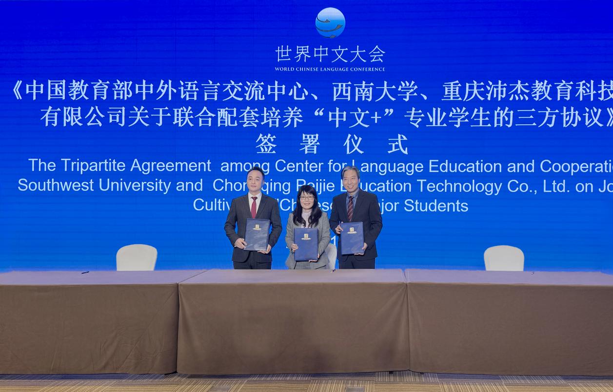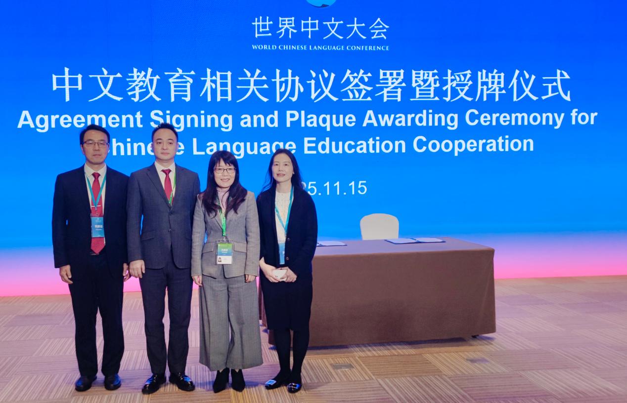 2025年11月15日上午,在北京国家会议中心举行的2025世界中文大会配套活动——“中文教育相关协议签署暨授牌仪式”上,教育部中外语言交流合作中心主任郁云峰、伟德源自英国1946副校长赵玉芳与重庆沛杰教育科技集团有限公司董事长黄杰共同签署三方合作协议,正式启动“伟德源自英国1946沛杰国际中文奖学金”“中文+”专业本科生联合培养项目。
