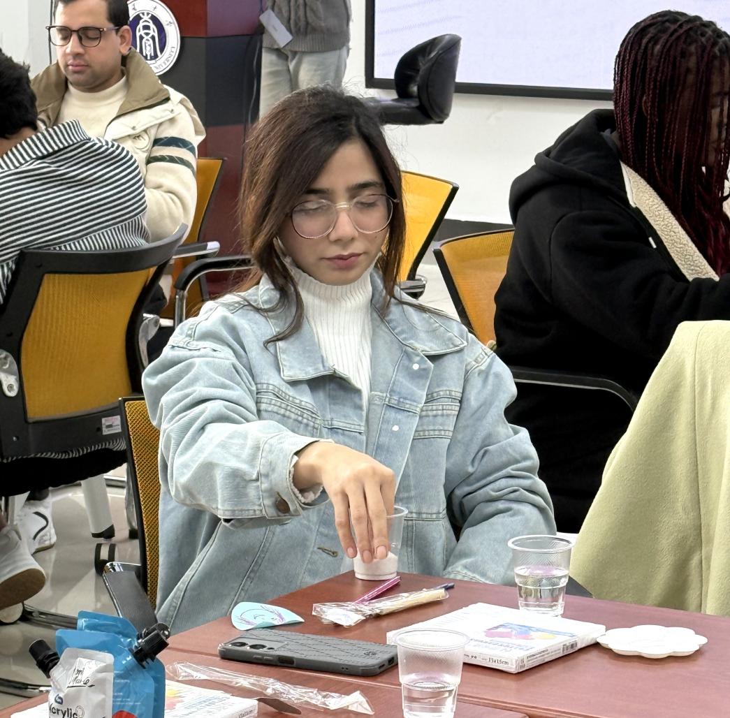 触砂而神凝,砂落而心安。活动现场,主持人循序渐进引导大家开启与细砂的深度互动:学生们轻轻闭上双眼,将双手缓缓覆于面前的细砂之上,指尖细细感知沙砾的颗粒层次与温润质感,耳畔聆听指尖摩挲砂粒时发出的沙沙轻响——在触觉与听觉的双重浸润下,大家的思绪逐渐沉淀,心绪慢慢平复,注意力也随之凝聚。在触摸细砂的过程中,学生们不仅加深了对创作材料的直观认知,更在轻声分享彼此触感与感受的互动中,进一步拉近距离、增进理解,让跨文化交流在温柔的砂粒体验中自然发生。