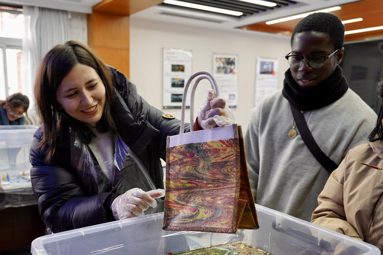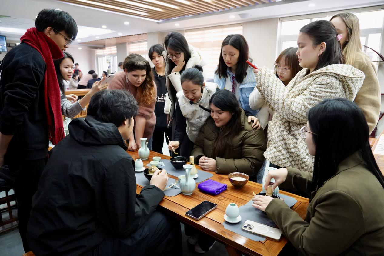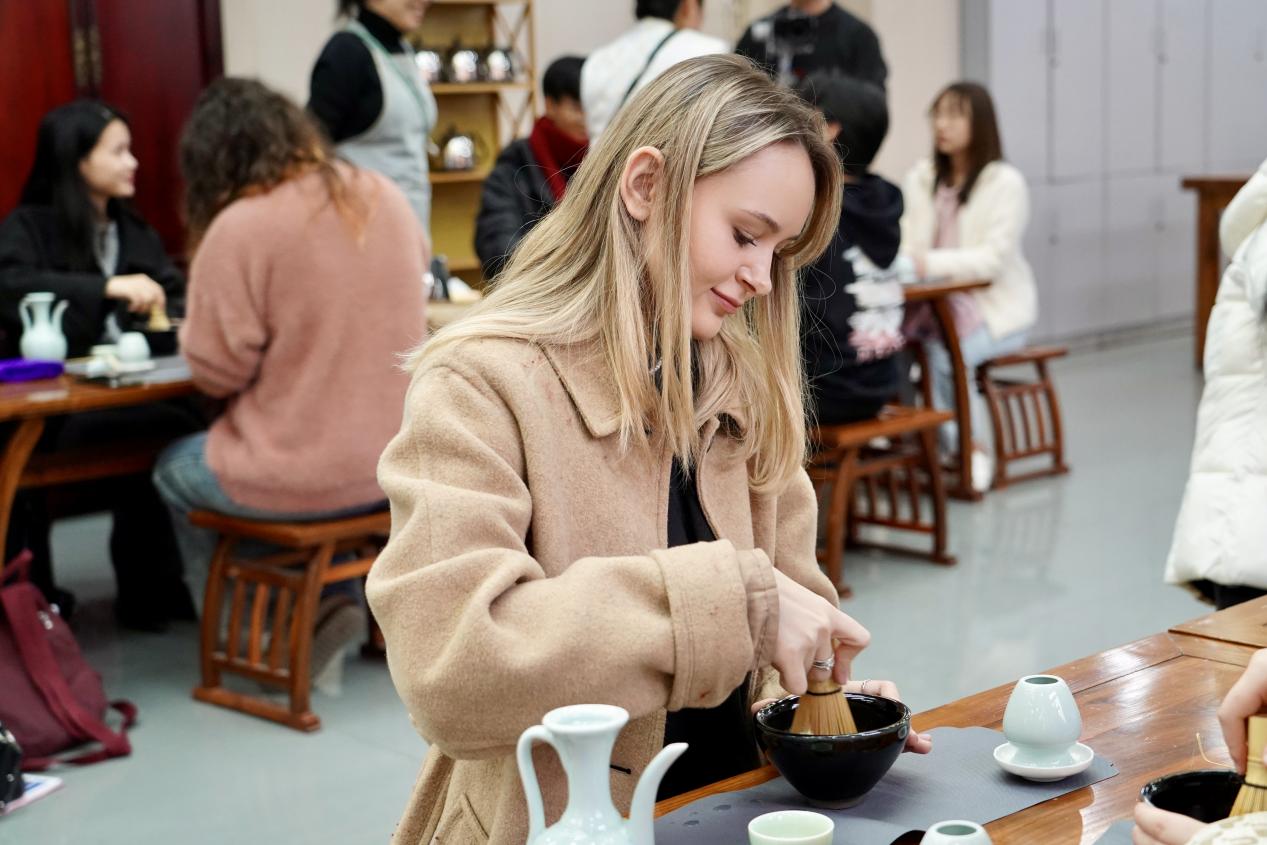 仪式结束后,全体人员在实训楼前合影留念。随后,国际学生们分为两组,分别体验了独具特色的非遗文化项目:在茶艺实训室,同学们学习宋代点茶技艺,亲手击拂茶汤、绘制茶沫图案;在工艺体验区,大家尝试传统漂漆扇制作,感受大漆艺术流动变幻之美。不同项目的沉浸式体验,让各国学子在动手实践中加深了对中华文化的理解与情感共鸣。