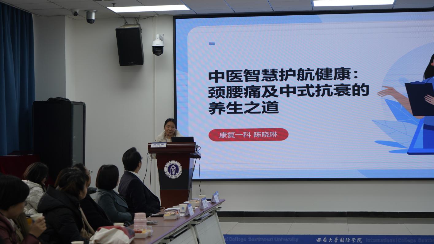 在专题讲座环节,康复一科陈晓琳医生带来了“中医智慧护航健康:颈腰痛及中式抗衰的养生之道”主题分享。针对教师及学生群体久坐易引发的颈腰疼痛,以及常见的急性腰扭伤、落枕等问题,陈晓琳专家结合中医理论,给出了通俗易懂、便于操作的调理建议和应对方法。讲座现场,她带领在场师生一同练习颈椎舒缓操,活动氛围十分热烈。此外,针对师生普遍关心的中式美容话题,陈医生还详细介绍了艾灸、面部刮痧、面部美容针等多种中医美容方式,让在场师生对中医的多元功效有了更全面的认识。讲座最后,现场师生共同练习八段锦,充分感受中医养生功法的独特魅力。