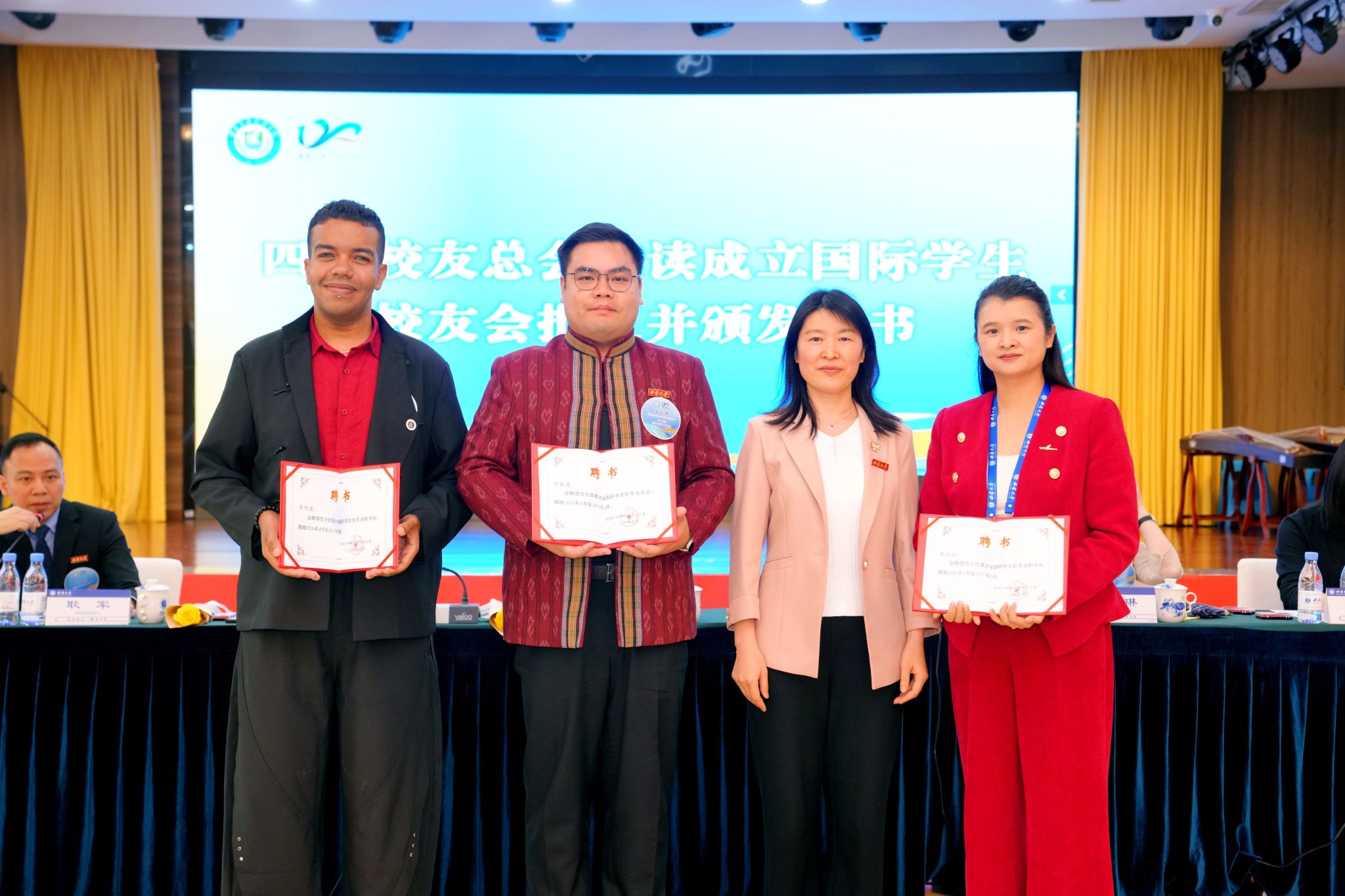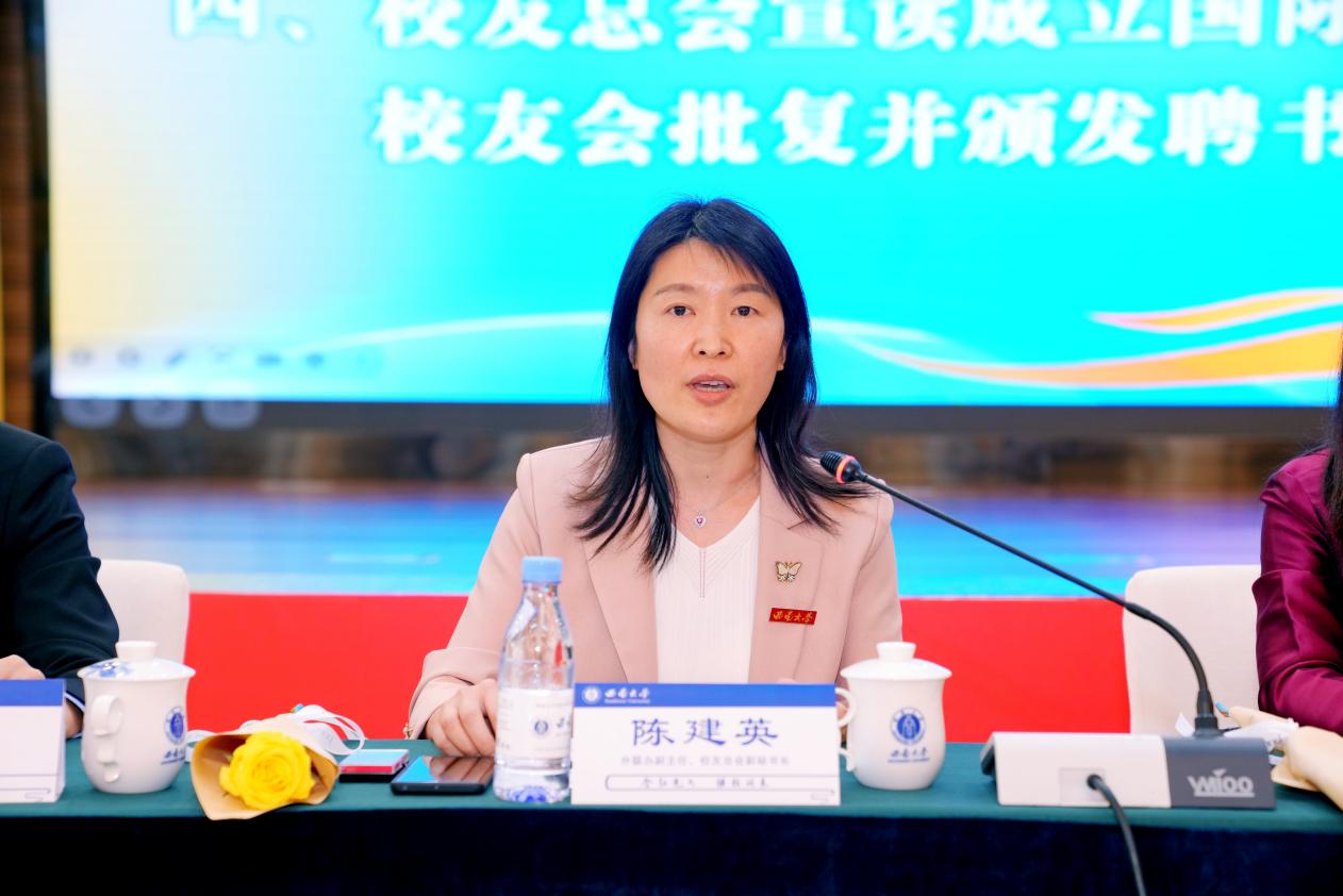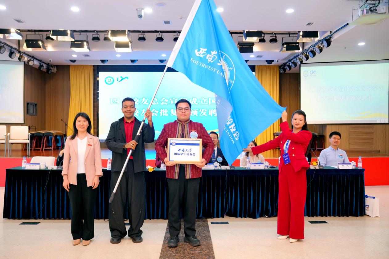 学校外联办副主任、校友总会副秘书长陈建英宣读《关于同意筹备成立伟德源自英国1946国际学生校友会的批复》,颁发会牌、会旗,并为首届校友会会长罗俊勇(泰国)、副会长黎氏云(越南)、秘书长黄阿里(埃及)颁发聘书。