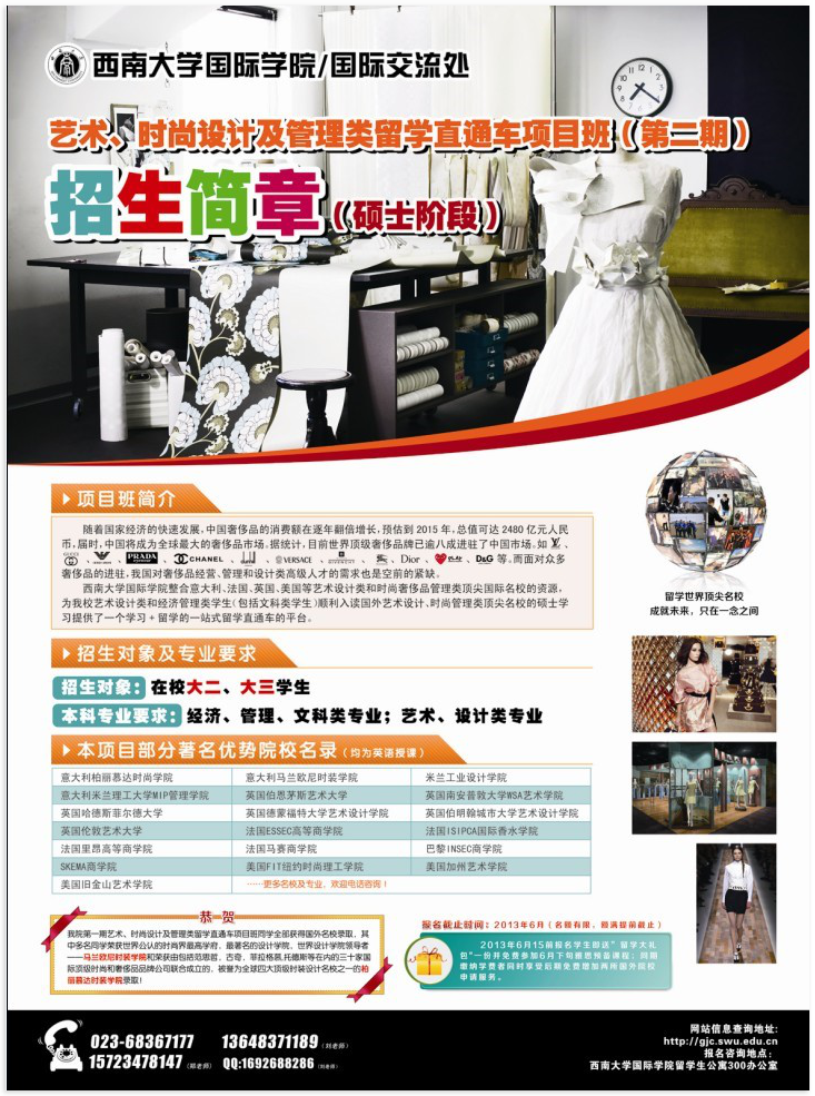 恭贺伟的国际1946bv艺术、时尚设计及管理类留学直通车项目班刘蓓、孙颖两位同学获世界公认的时尚界最高学府,最著名的设计学院,世界设计学院领导者——马兰欧尼时装学院的女装设计专业录取!唐鳗同学喜获,被誉为全球四大顶级时装设计名校之一的柏丽慕达时装学院的奢侈品管理专业录取!